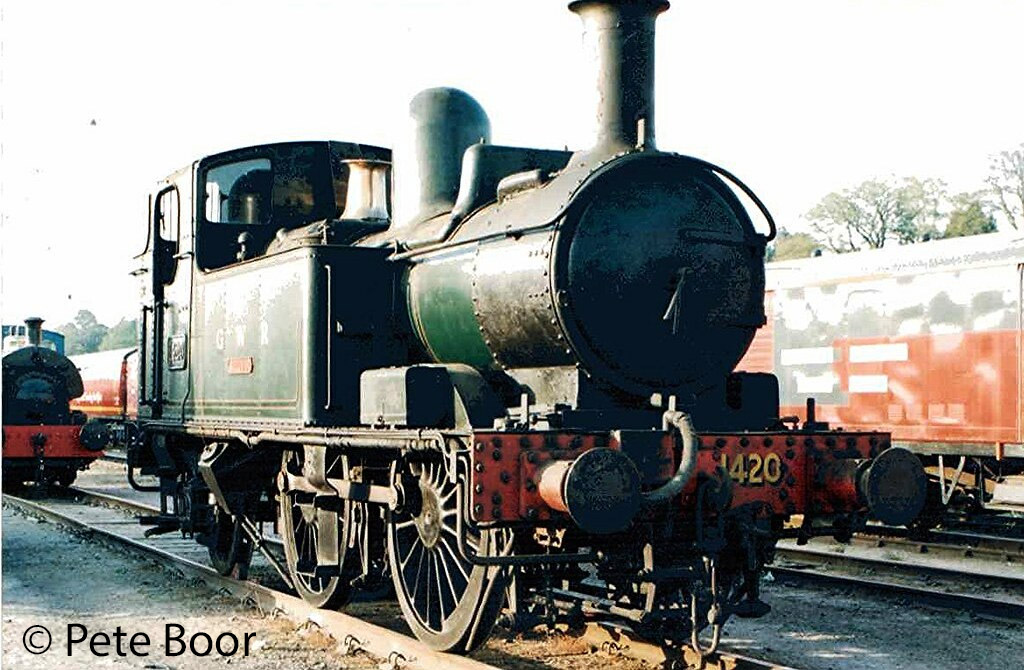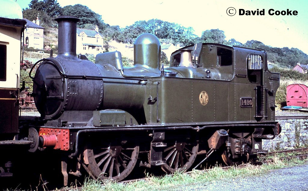 4820 was completed at Swindon in November 1933 at a cost of £2285 for the engine and boiler, plus a further £70 for the automatic train control and auto-gear (push and pull equipment) with which it was fitted. The life of 1420 was spent in Wales, having been allocated to Pontrilas and Pontypool Road throughout the 1930s and 1940s. Renumbered from 4820 to 1420 in November 1946 at Cathays Shed, 1420 found itself at Fairford in 1953, Oxford in 1956 and Exeter in 1959, after a spending a nearly a year at Southall. After a time at Hereford shed, where 1420 worked the Leominster to Kington branch, it was finally withdrawn from Gloucester shed having travelled over 600,000 miles in October 1964 and entered preservation, arriving at Buckfastleigh in 1965.