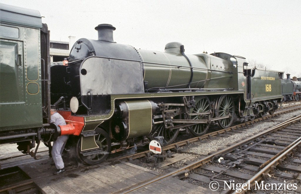 For the next 17 years it worked on the North Downs line (Reading to Redhill) and between Eastleigh (near Southampton) and Woking. A few alterations were made such as smoke deflectors fitted in 1935, and for 5 years it had a larger tender allocated. From December 1945 it was moved to a Salisbury sub-shed at Andover to work the Southerns Railways line to Swindon. At nationalisation in 1948 1618 became 31618 and in April 1951 was moved again to Nine Elms (now the site of New Covent Garden fruit and veg wholesale market). There then followed a succession of changes until settling a while at Eastleigh (1954) to work the Hampshire routes.