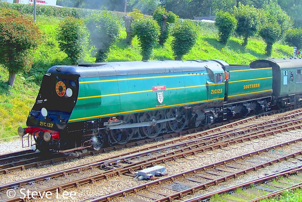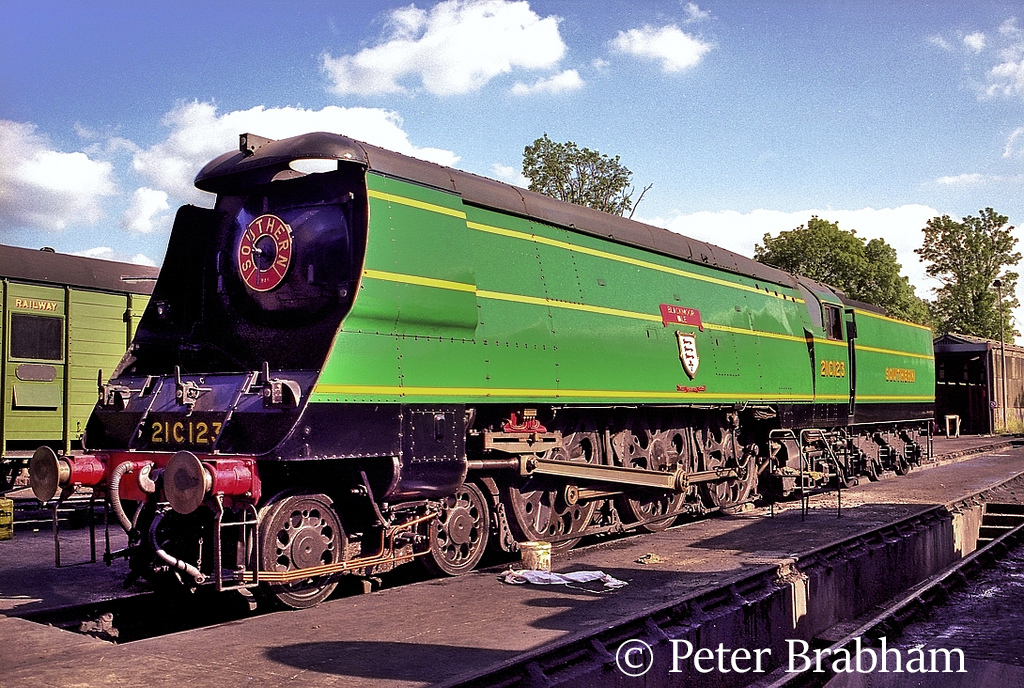 Five years later, in 1976, 21C123, Blackmoor Vale returned to traffic on the Bluebell Railway, resplendent in Malachite green. It was repainted in BR Green in 1984, its final BR livery, with additional cosmetic work being undertaken to give the locomotive the ‘1967’ appearance. It was withdrawn from traffic in 1985. Its tender was lent to Battle of Britain class pacific 34072, 257 Squadron and was used with the locomotive on the Swanage Railway.