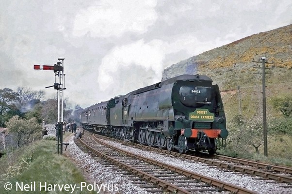In 1948, after the formation of British Railways, the locomotive was renumbered into the Southern Railway’s classification as 34023 still with the distinctive Southern roundel on the smokebox and with the lettering British Railways on the tender sides. The locomotive lost the Malachite green livery in 1950 when based at Salisbury and was repainted in BR Green with two orange and black lines replacing the upper and lower yellow lines of the earlier livery. The first BR lion and wheel emblem appeared on the tender, replacing the British Railways lettering. At the same the name was altered to Blackmore Vale.