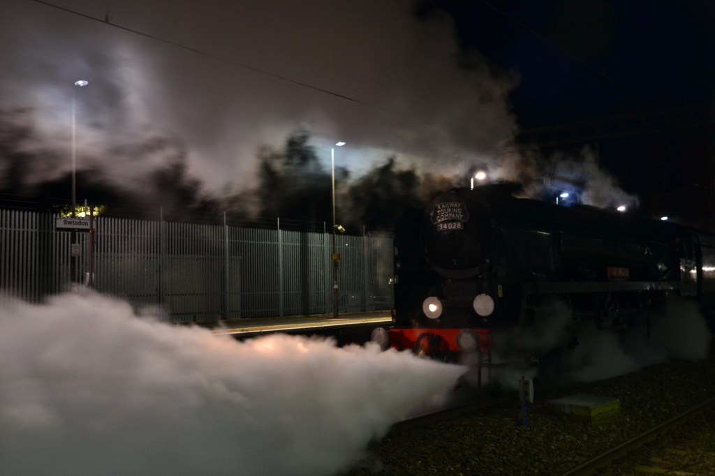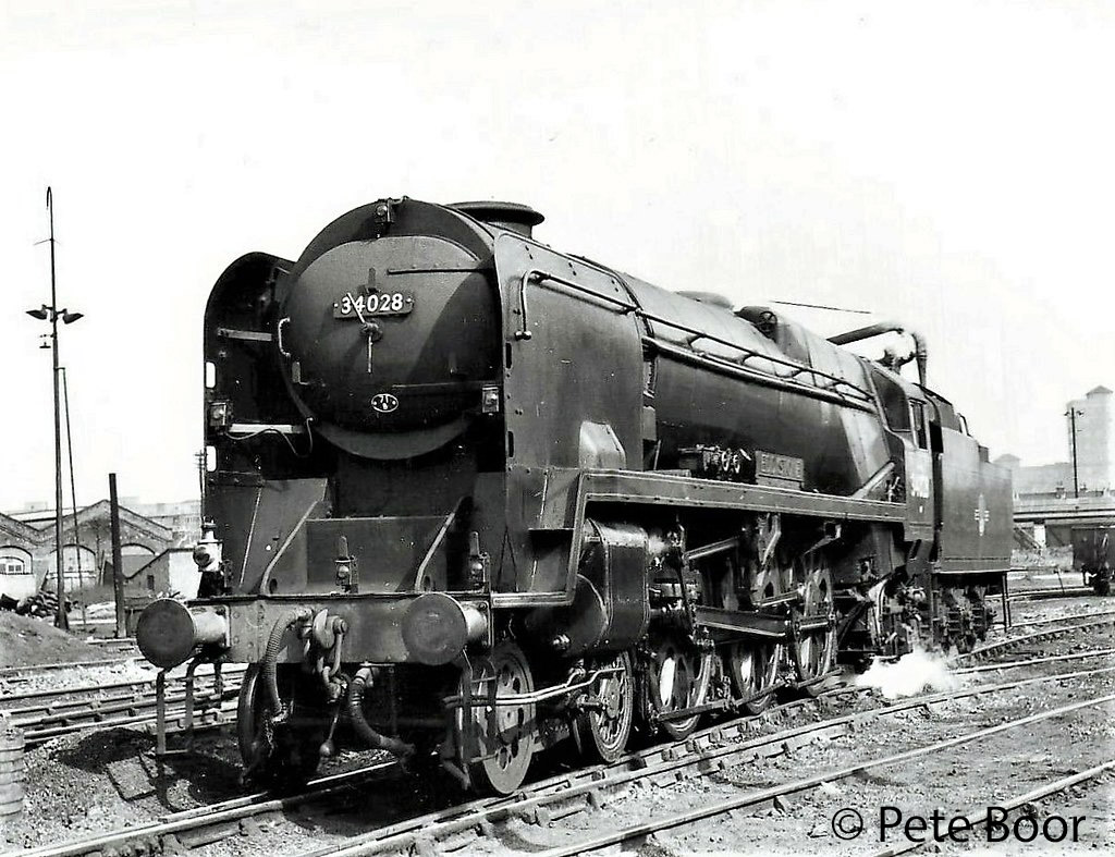 21C128 Eddystone was built at Brighton Works by the Southern Railway in 1946 and went straight into traffic from Ramsgate where it took up regular duties on the Kent Coast services to Victoria and Cannon Street. Following the nationalisation of the railways in 1948, Eddystone was re-allocated to Exmouth Junction in 1948, and renumbered 34028 at the end of that year. It soon appeared on that depot’s top-link duties such as the Atlantic Coast Express and the Devon Belle which it worked as far as Salisbury where it was based from January 1951. After a few months it returned to Exmouth Junction in March 1951.