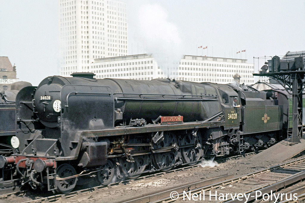 Eddystone was one of the first Bulleid light pacifics to be rebuilt in August 1958 and was then transferred to Bournemouth in February 1959 where it worked services over the main line between Weymouth and Waterloo. It was also a regular performer on the Somerset and Dorset route to Bath. During this period it was often photographed on the most famous of the S & D trains, the Pines Express. In September 1962 it was transferred to Eastleigh and in the following year it worked a Southampton FA Cup special through to Birmingham Snow Hill. In May 1964 Eddystone had the dubious honour of being the first rebuilt Bulleid Light Pacific to be withdrawn after covering 851,549 miles.