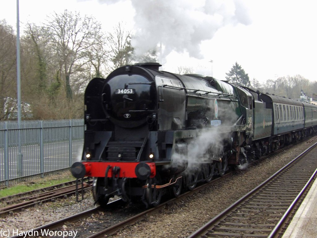Things didn’t work out as planned, and in 1995 the locomotive moved to Thingley Junction (west of Chippenham, where the Melksham line leaves the line to Bath). Passengers will have noticed a lonely looking steam engine, minus front bogie and pony truck, as they flashed by in an HST. Little work was done on 34053 during this period, and ultimately it was sold to Jeremy Hosking for use as spare parts for 34046 Braunton and moved to Bishops Lydeard on the West Somerset Railway in 1997.