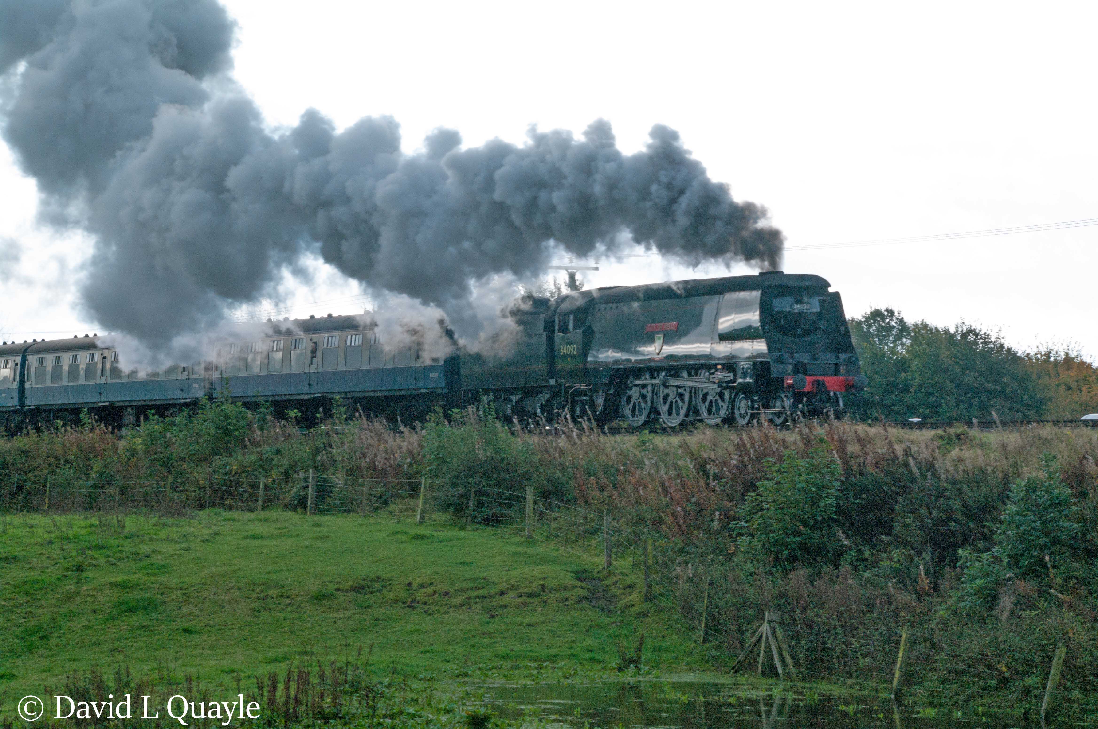 In May 2015 the locomotive was being transported by road from the KWVR to the Gloucester Warwickshire Railway when the low-loader was stopped at junction 30 on the M62 when a weighbridge check identified that the vehicle was over the permitted axle-loading. This was because 34092 had not been emptied of water before the journey – in fact it was full and the total weight was 86 tons whilst the maximum permitted load was 72 tons. After emptying the boiler 34092 continued to the Gloucester Warwickshire Railway.
