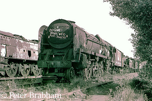 Dai Woodham left his fleet of around 250 locomotives intact to slowly corrode away in the salt laden sea air on the side of the old docks. In 1980 Dai Woodham announced he would cut up all locomotives without reservations on them, 35025 being one such. In July 1980 the flow of scrap wagons and track panels had dried up and three locomotives were earmarked for scrapping including 35025.