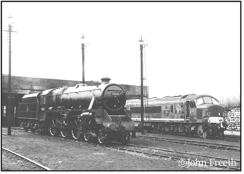 45025 was withdrawn from service in August 1968 at the end of steam operations on BR. Its last task was to double head with 45390 on the Carnforth- Hellifield-Lostock Hall leg of the Locomotive Club of Great Britain ‘s Farewell to Steam railtour in early August 1968.