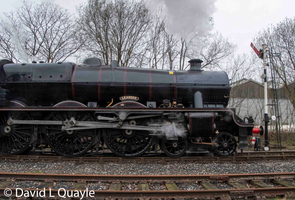 Leander was then restored to running condition on the East Lancashire Railway in LMS Crimson Lake livery in 2002.