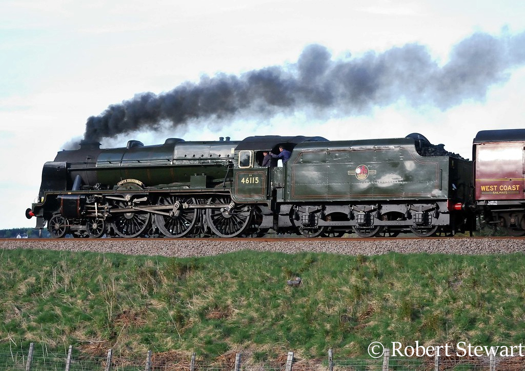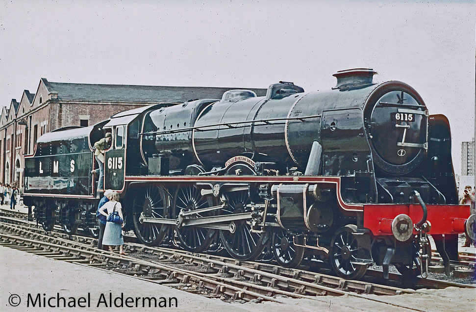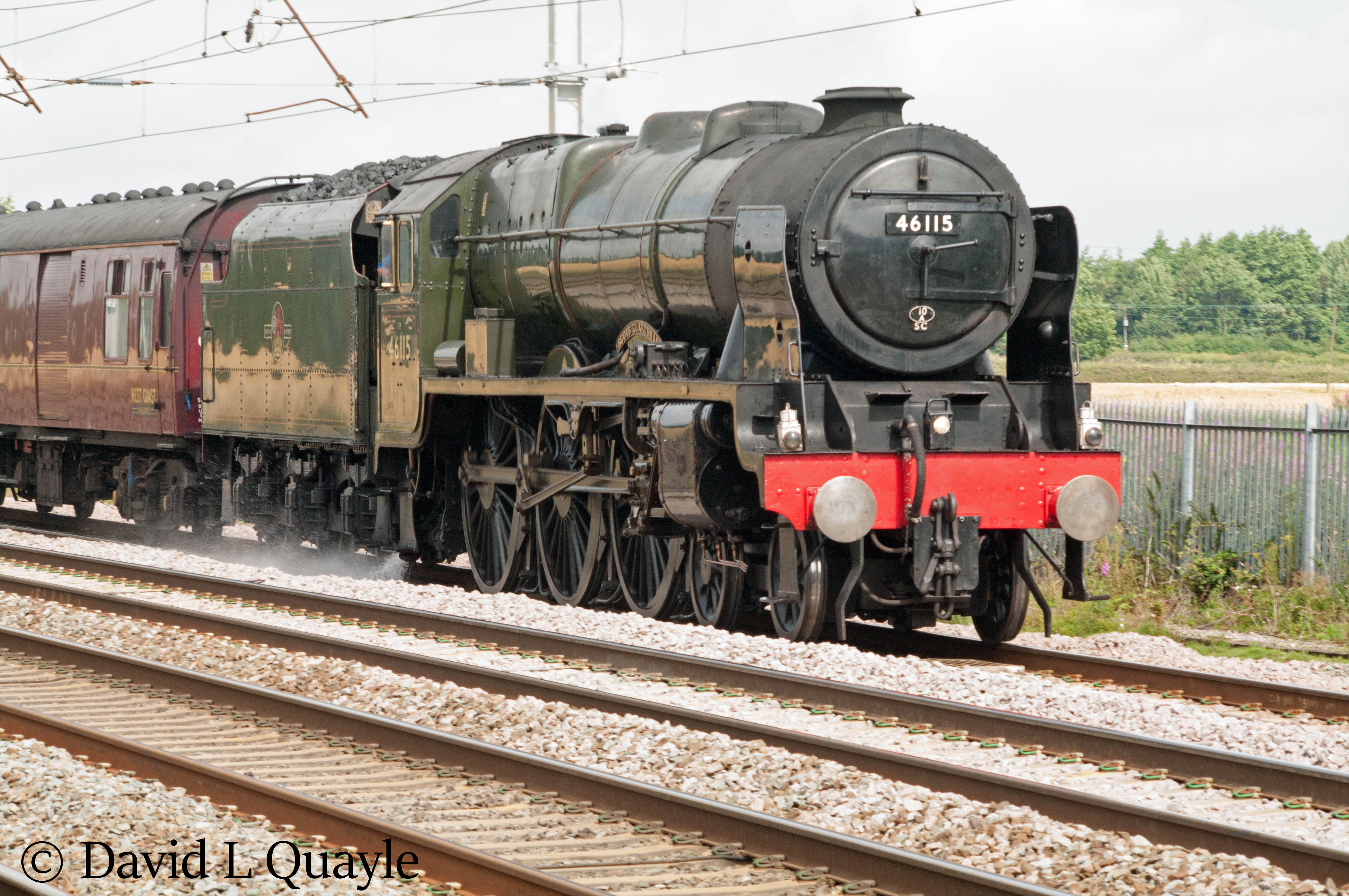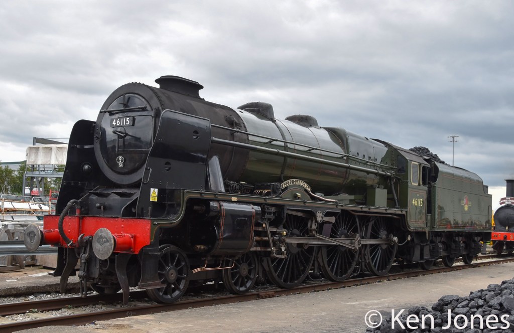 6115 was rebuilt in 1947 with a new tapered type 2A boiler, and was painted in LMS 1946-style black livery. It was the first of the rebuilt engines to receive smoke deflectors and the only one to run with them as an LMS engine. It was renumbered 46115 by British Railways in 1948 and was the last of the class in service from service at Carlisle Kingmoor depot in December 1965.