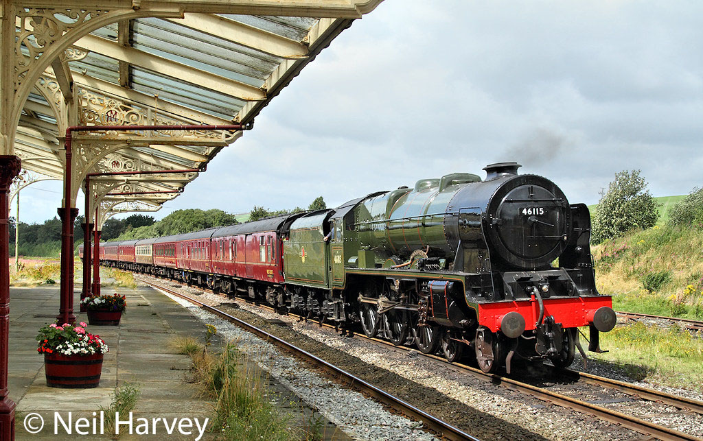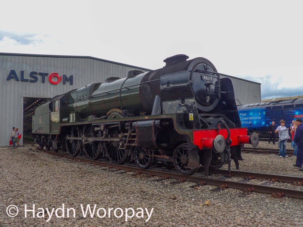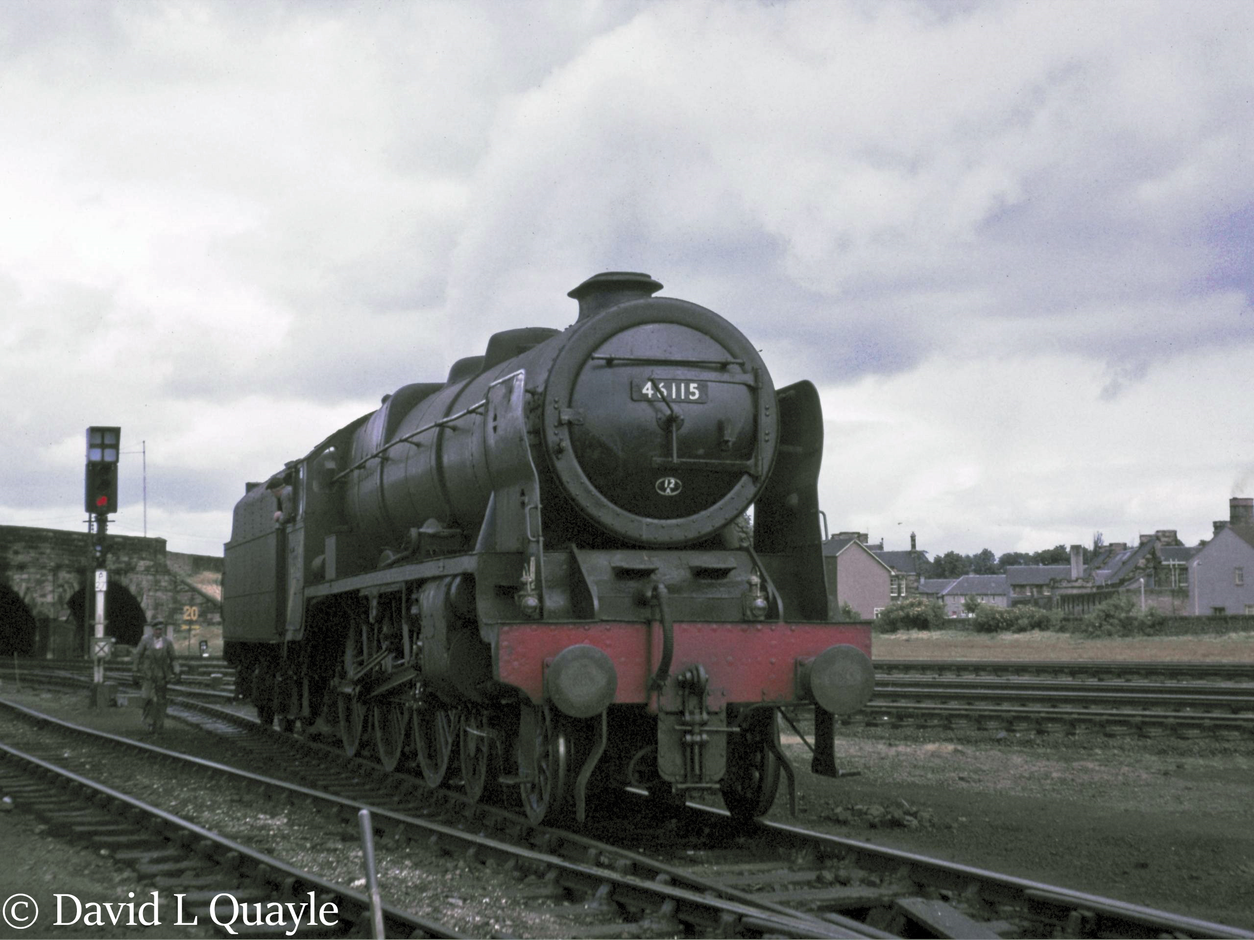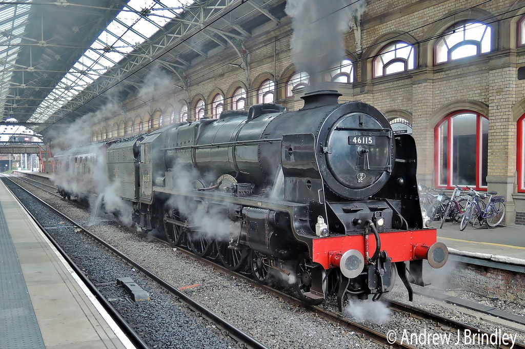 6115 was rebuilt in 1947 with a new tapered type 2A boiler, and was painted in LMS 1946-style black livery. It was the first of the rebuilt engines to receive smoke deflectors and the only one to run with them as an LMS engine. It was renumbered 46115 by British Railways in 1948 and was the last of the class in service from service at Carlisle Kingmoor depot in December 1965.