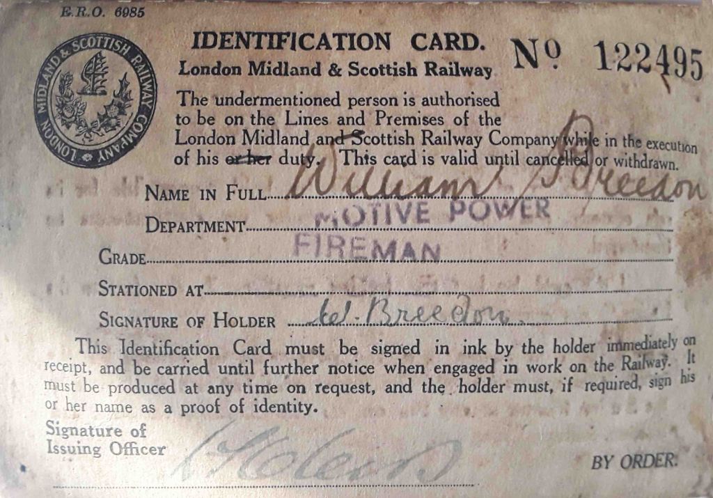 Copied below is the LMS identity card for William Breedon issued to him whilst he was still a fireman.