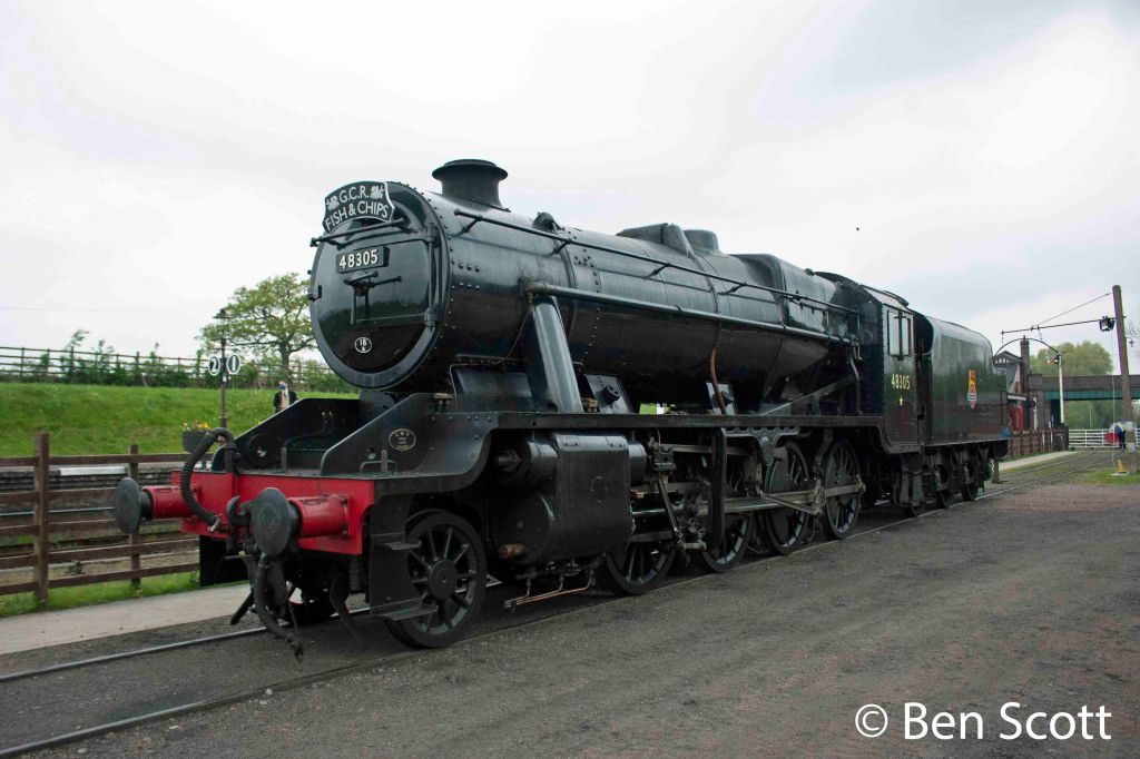 It worked extensively on the GCR’s passenger and freight services and was particularly at home of the “Windcutter” train, the train of 16 ton mineral wagons so reminiscent of the original GCR. 48305 proved a free steaming and free running engine and was well liked by all the locomotive crews who had the privilege of driving her. 48305 became a much travelled locomotive in preservation, spending periods at the Midland Railway Centre, North Norfolk and Gloucestershire and Warwickshire Railways. It made an appearance at the GCR(N) at Ruddington in 2000 before going to the Churnet Valley Railway at Cheddleton in June of that year for a five-year period.