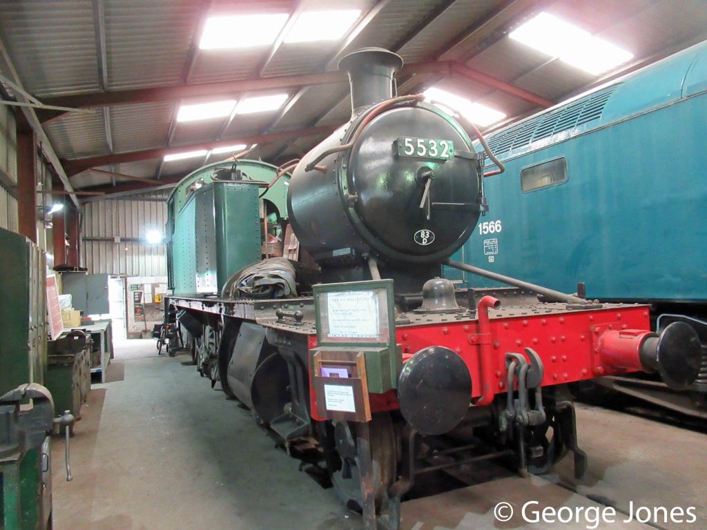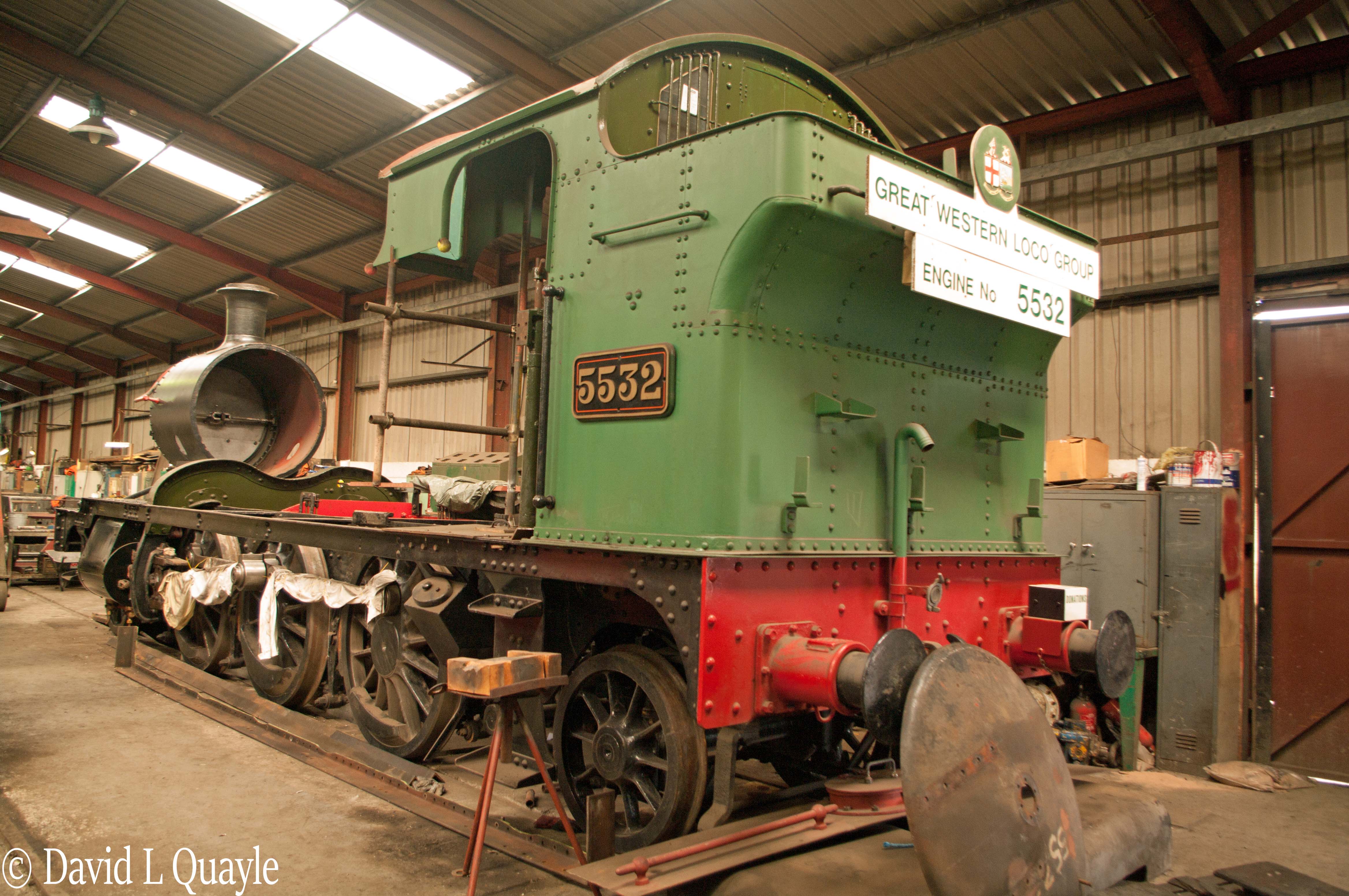 5532 was turned out from Swindon Works during June 1928 at a total cost of £3,602. After a few days running in at Reading, it was first allocated to Stourbridge Junction for duties in the West Midlands. Its next shed was Worcester. Later, whilst at Newport Ebbw Junction, 5532 was used to haul the Royal Train on 22nd October 1941. With classmate 5516, it hauled the train from Hereford to Monmouth Troy. Later the same day it hauled the Royal Train (with King George VI on board) from Monmouth Troy to Ross on Wye.