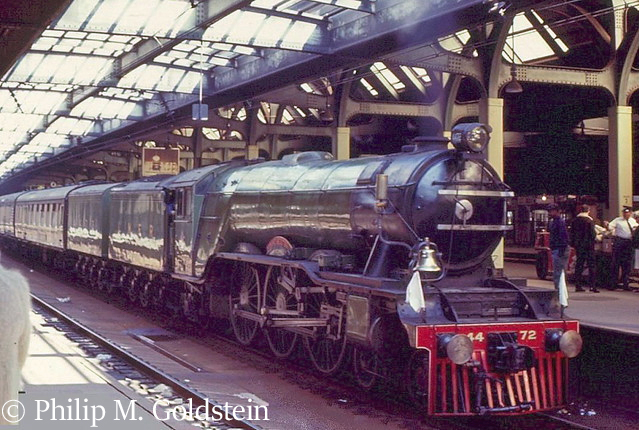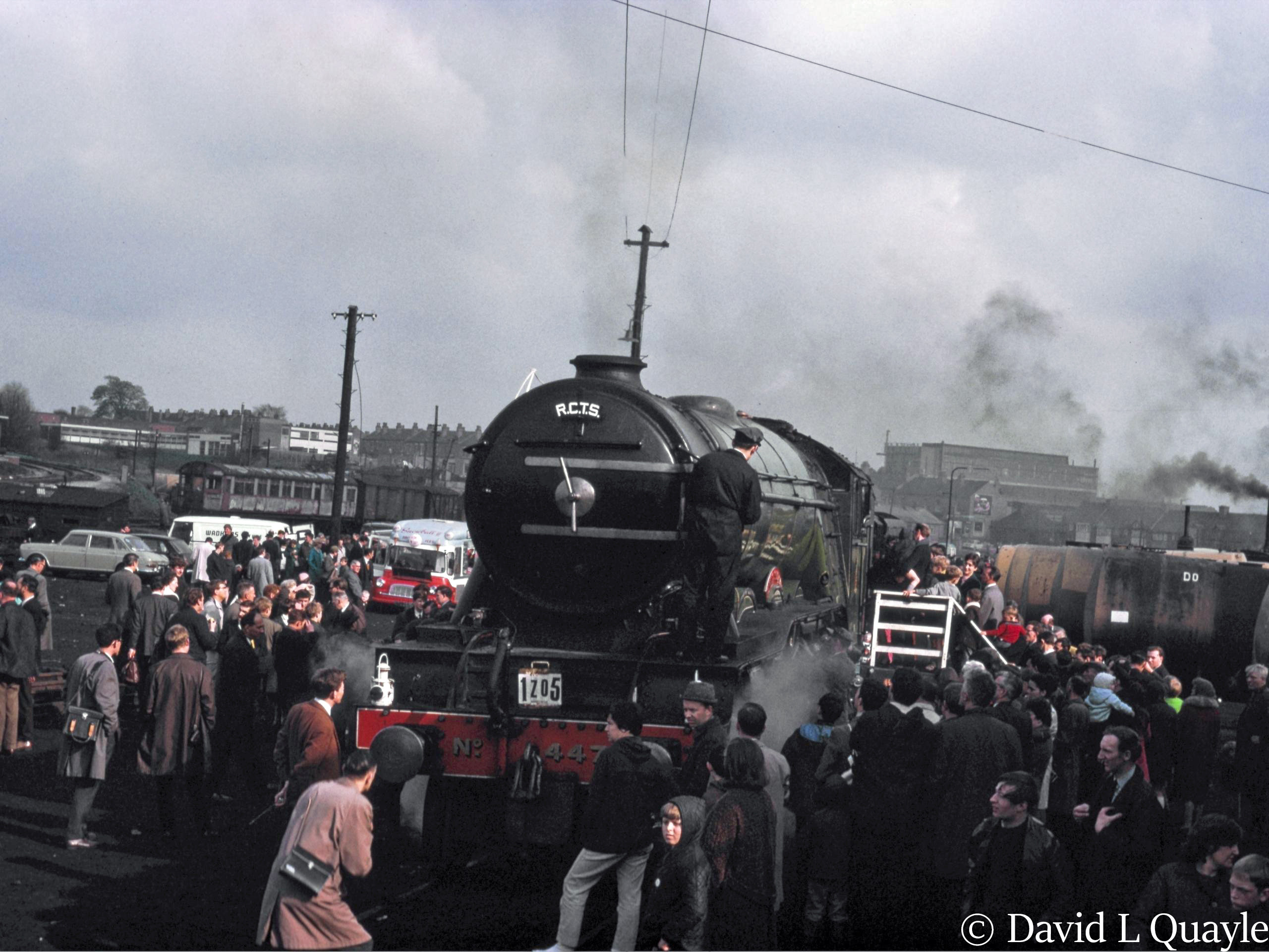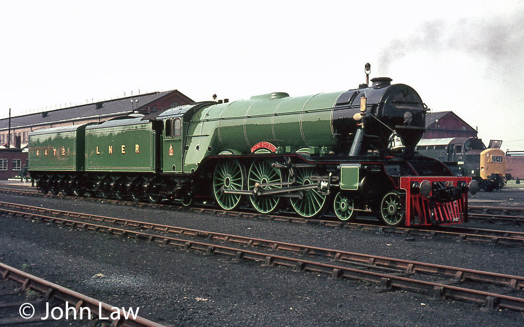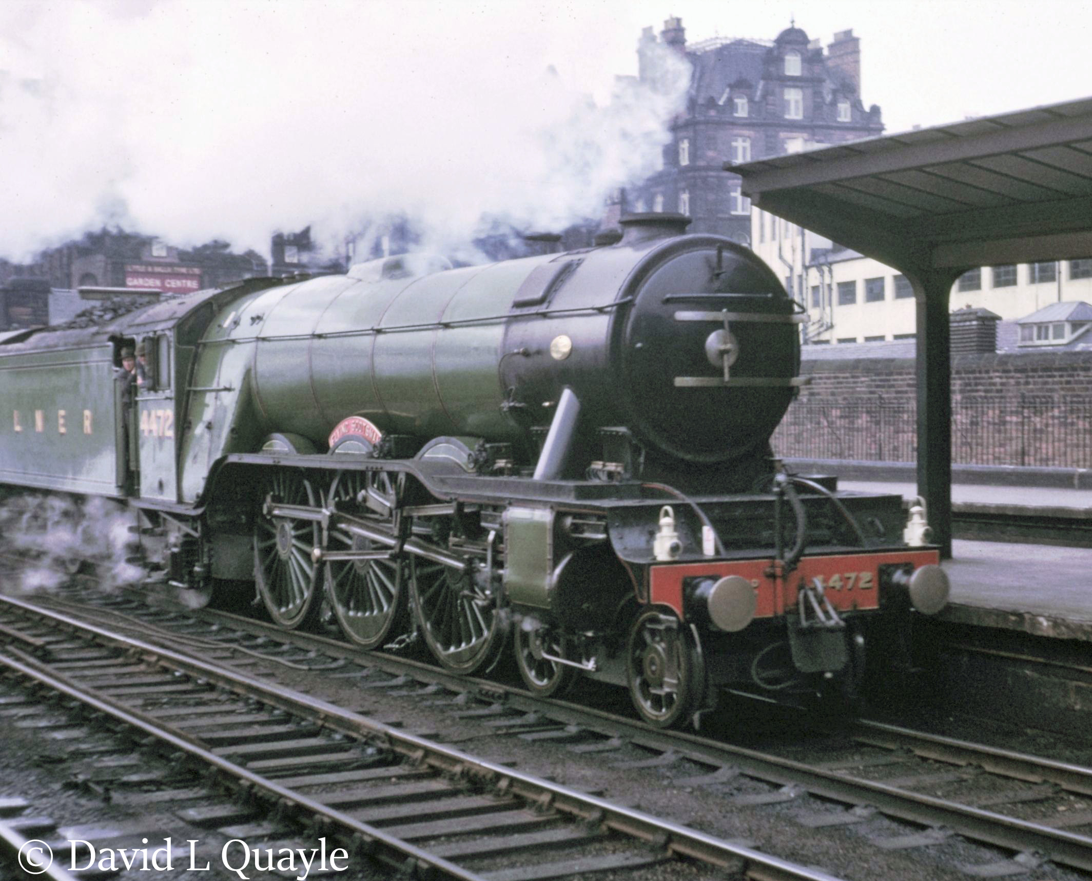 When it was withdrawn in January 1963 it had covered 2,076,000 miles in service. It was purchased by Alan Pegler for a scrap value of £3,000. Peglar removed the German-style smoke deflectors and fitted a corridor tender an applied a lined LNER Doncaster green livery. After 20 months of charter trains, it entered Doncaster for a change of boiler and overhaul. This time it was repainted in a traditional Darlington Green livery with black and white lining. With the demise of BR steam, water supplies were hard to get, and so in 1966 Alan Pegler added the Flying Scotsman’s famous second tender. This tender was a corridor type, which was adapted to store 6000 gallons of water. By the time of the next overhaul in 1968, it had to be overhauled by Hunslet (Leeds), because Doncaster was no longer able to overhaul steam locomotives.