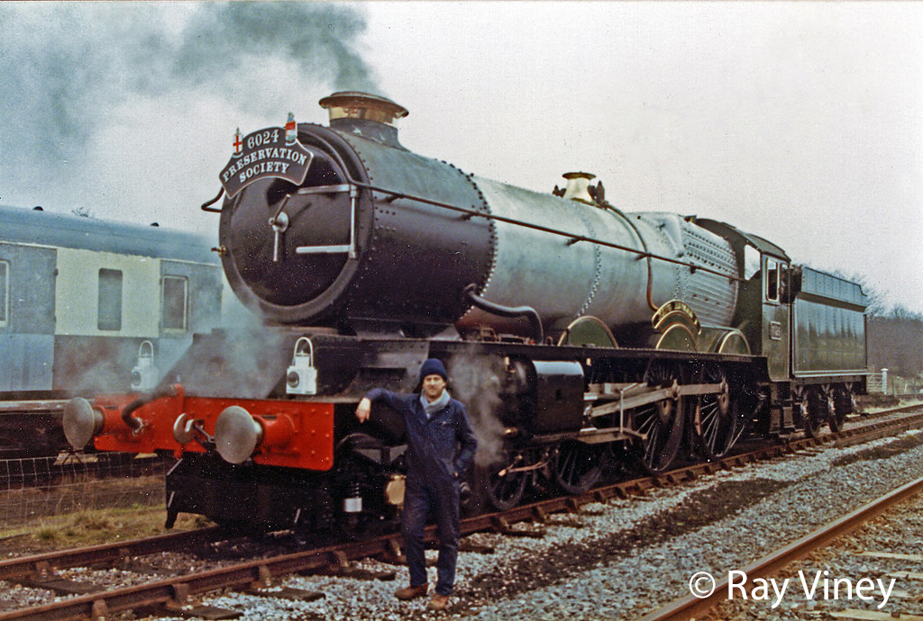 Inspired by preserved class-mate 6000 King GeorgeV’s 1971 breach of British Rail’s steam ban, in 1973 the King Preservation Society wanted to restore a locomotive to mainline condition. Both Nos. 6023 and 6024 were available for purchase, but No. 6024 was preferred, because after a derailment in the Barry yard No. 6023 had had its rear driving wheels torched through, and at the time was considered beyond repair.