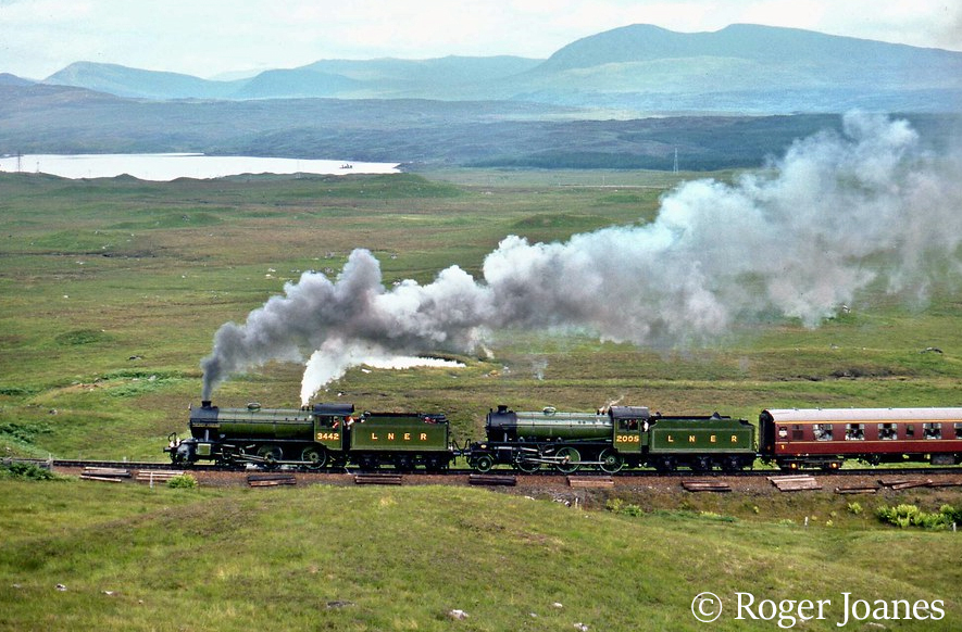 61994 The Great Marquess pilots K1 62005 over Rannoch Moor witha Centenary Special for Fort William – August 1994