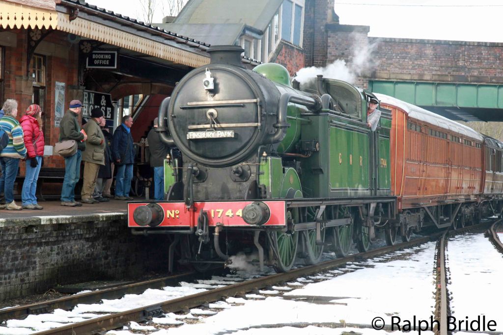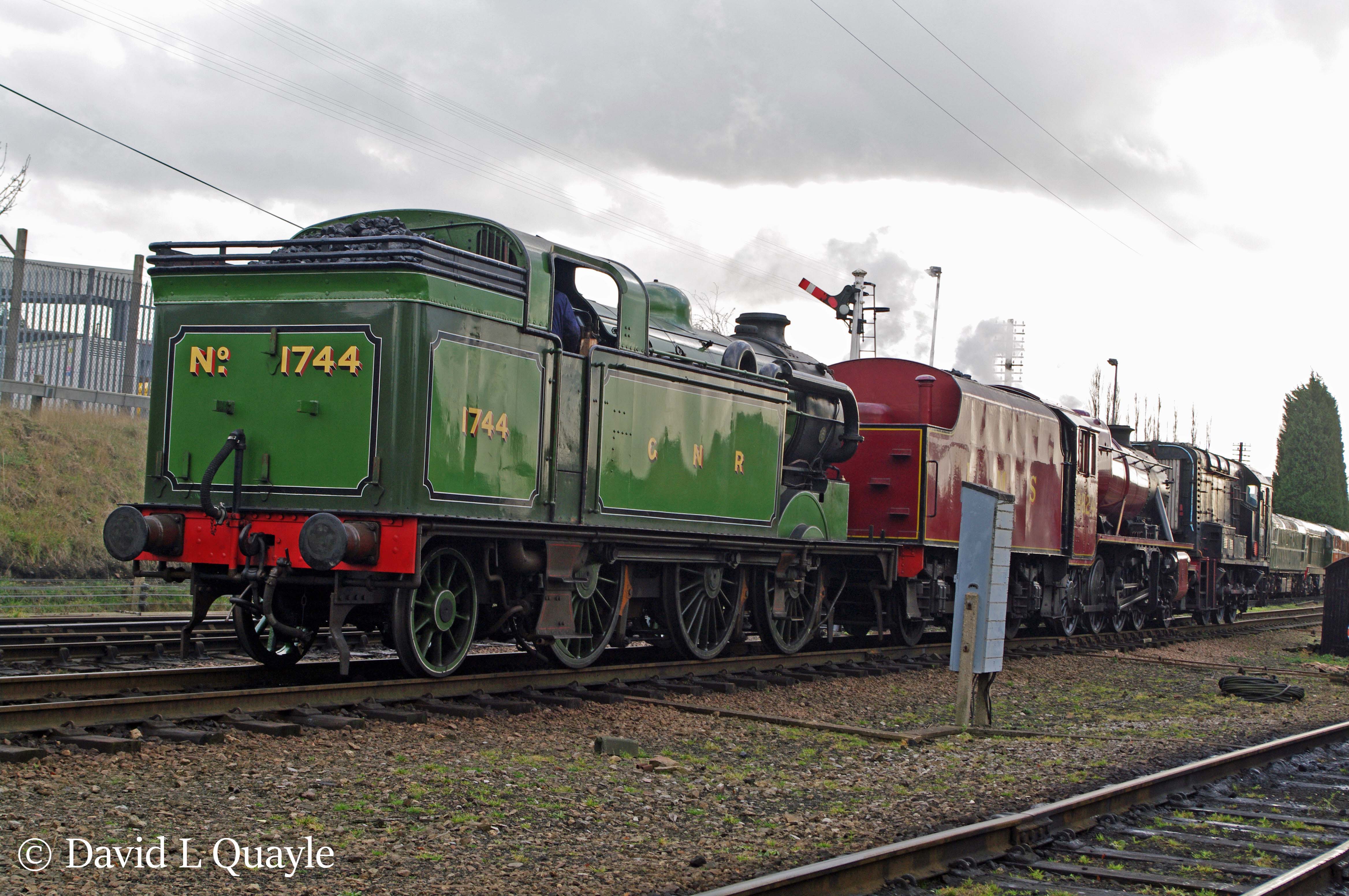The locomotive then entered a prolonged overhaul with the intention of returning it to as near GNR condition as possible. A thorough strip down of the locomotive took place. By the 1744 had a boiler built in the 1940s and with Ross pop safety valves, not the original Ramsbottom type, so while not totally achievable, some of the changes made over the years have been reversed during this overhaul to enable appearance in GNR livery to be reasonably authentic. Strangely, for many years 1744 had LNER Group Standard buffers. A Stirling tender in the NRM yard provide two of the appropriate GNR barrel buffers.