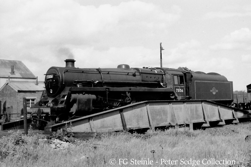 At Neasden 73156 worked over the Great Central line where the standard workload of the Standard class 5 locomotives allocated there included hauling The Master Cutler (Marylebone-Sheffield) and The South Yorkshireman (Marylebone-Bradford Exchange).