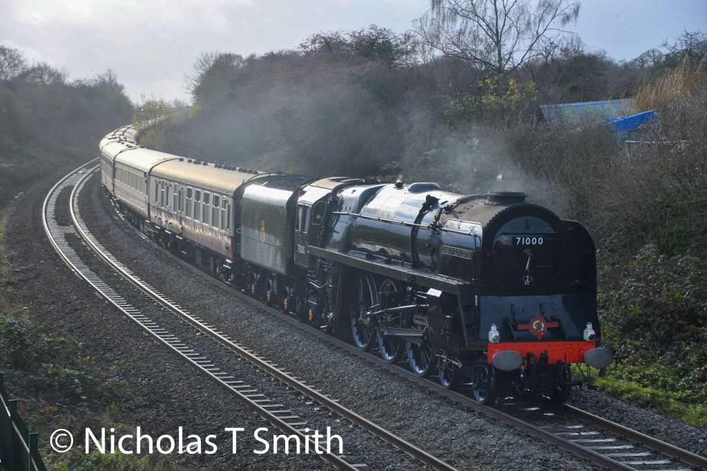 In October 1995 71000 climbed the notorious Shap bank on the West Coast main line and topped the summit at the highest speed ever attained with a heavy load. Weather conditions on the day were so atrocious the engine could not be fully opened out, for fear of wheelslip.