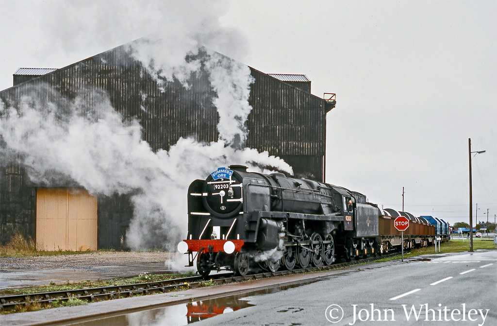 In September 1982 92203 hauled the heaviest freight train in Britain when it pulled a freight train of 2,198 tonnes at Foster Yeoman’s Tor Works.