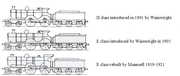 Wainwright introduced the class E locomotive in 1905 as a version of the D class with Belpaire boilers, extended smokeboxes and fluted coupling rods. They were more powerful than the D class because of a slightly higher boiler pressure and slightly smaller wheels. All of the E class locomotives were built at Ashford.
