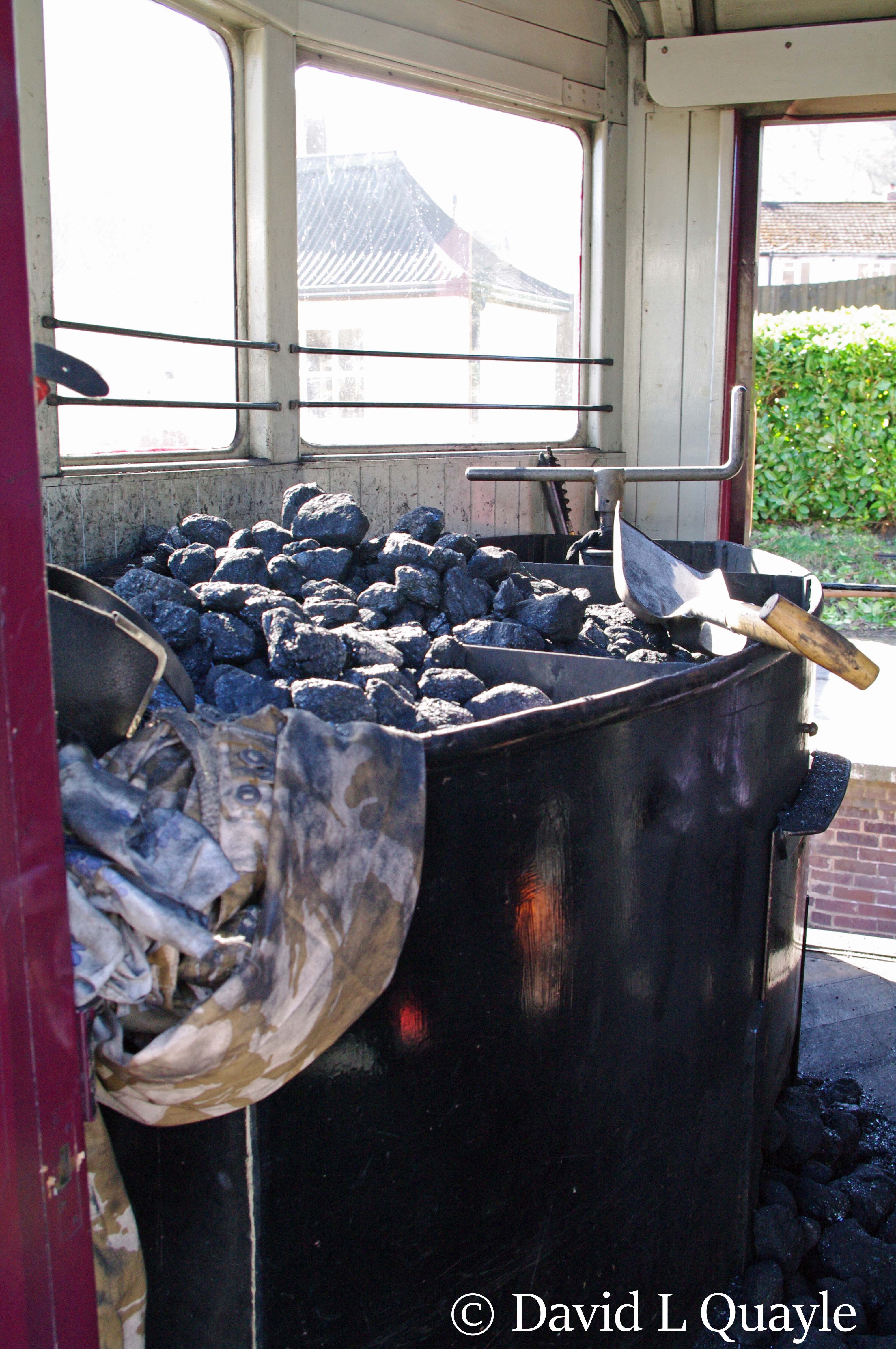 In June 2012 93 was approved for main line operation, even though the re-introduction of wooden bodied vehicles had not been allowed for many years, and was subject to restrictions to reduce the possibility of collisions and any subsequent damage. The water capacity being only 450 gallons means that it has to stop to take on water at frequent intervals – the owners like to limit it to 12-15 miles before being topped up. The coal capacity is limited to three- hundredweight and coal can only be put on the fire whilst the vehicle is stationary but fortunately it is very economical in terms of coal consumption.